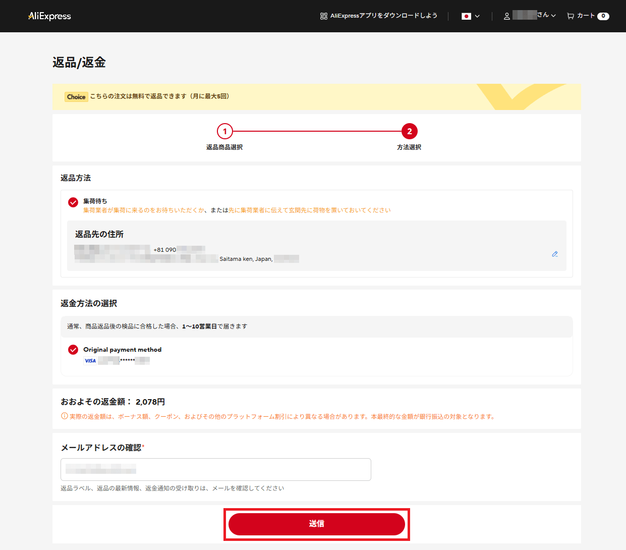 すると図のような画面に遷移するので、返品先の住所(日本語がオカシイが、自分の住所)・返金方法・メールアドレスを確認した上で図赤枠「送信」をクリックする。