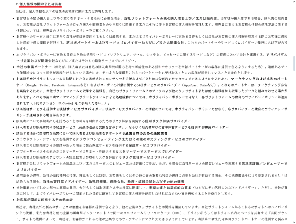 出典:AliExpress.comプライバシーポリシー「C. 個人データの開示または共有」